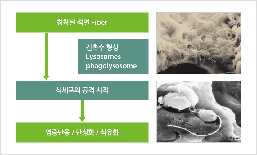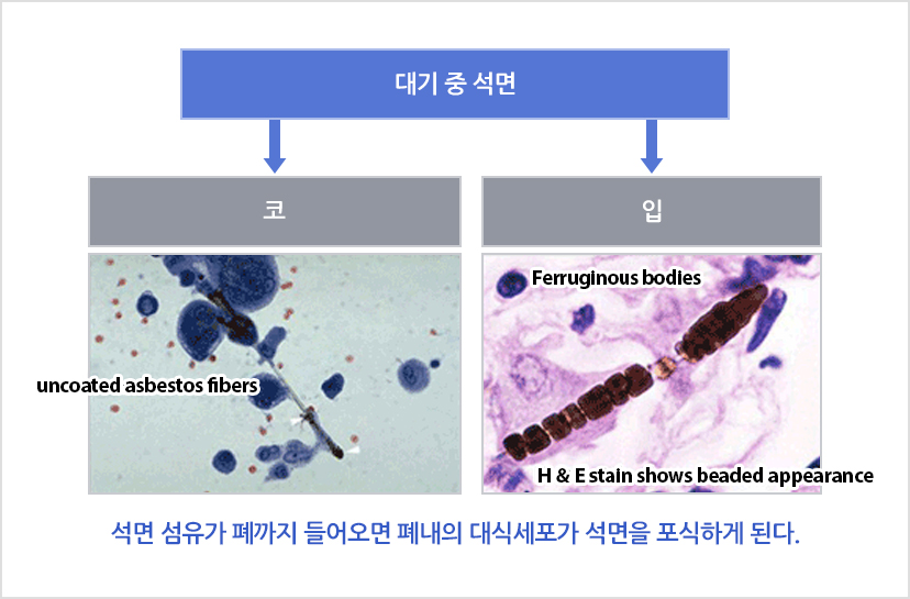 | 폐암 | 석면섬유가 폐에 들어가 폐장의 세포에 작용하여 세포가 이상 증식하는 악성 종양 |